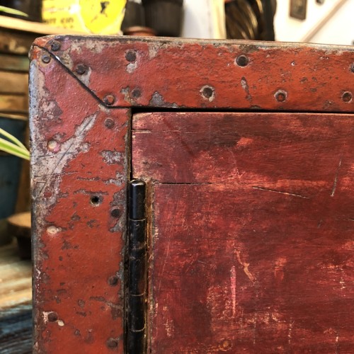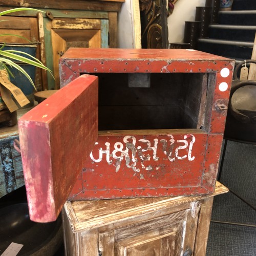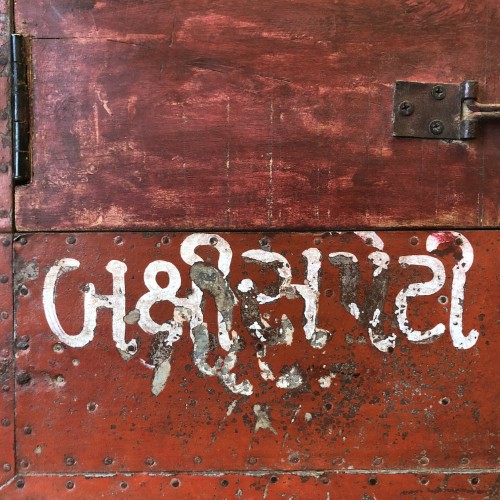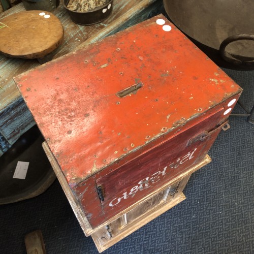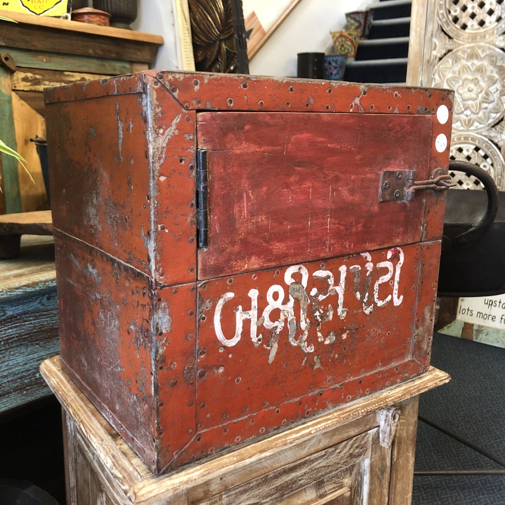 This fabulous, original vintage ‘bounty box’, originates from Gujarat and exudes culture, place and people. These items were often used as donation or for a wedding dowry box and make for an interesting historical piece. Quite heavy, being made of both wood and metal, this piece has at some point in it’s life, had a ‘newer’ door attached, while the original paint remains on the front, making for an eye-catching item.