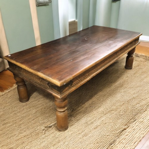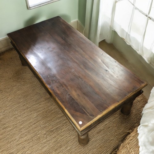 Enhance your living area with our rustic wooden coffee table, featuring intricate carvings and charming metal accents that add character to its design. The warm, dark-stained top and legs provide a cohesive look, creating a cozy, inviting atmosphere. Ideal for gatherings or quiet moments, this table embodies both functionality and style. Each piece showcases the craftsmanship of skilled artisans, reflecting a unique story. Sourced from the vibrant city of Jodhpur, India, this coffee table brings a touch of cultural heritage and rustic charm to your home.