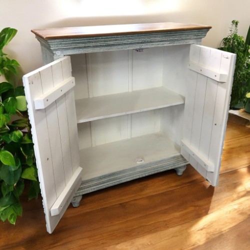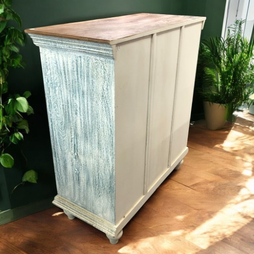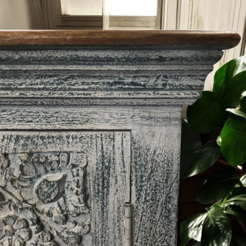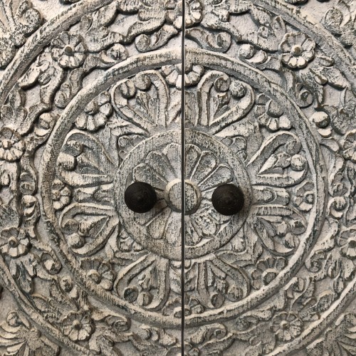 Transform your space with this stunning circular carved cabinet, expertly crafted to blend functionality with artistic elegance. The cabinet features a warm natural wood finish on the top, beautifully contrasting with a whitewashed exterior that reveals subtle hints of dark green. The standout circular design on the doors, adorned with intricate flowers and leaves, showcases exceptional craftsmanship. Inside, you’ll find a spacious shelf, perfect for storing your treasures. Set upon attractive turned feet, this cabinet is not just a storage solution but a statement piece, handmade in Jodhpur, India.