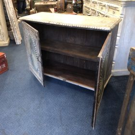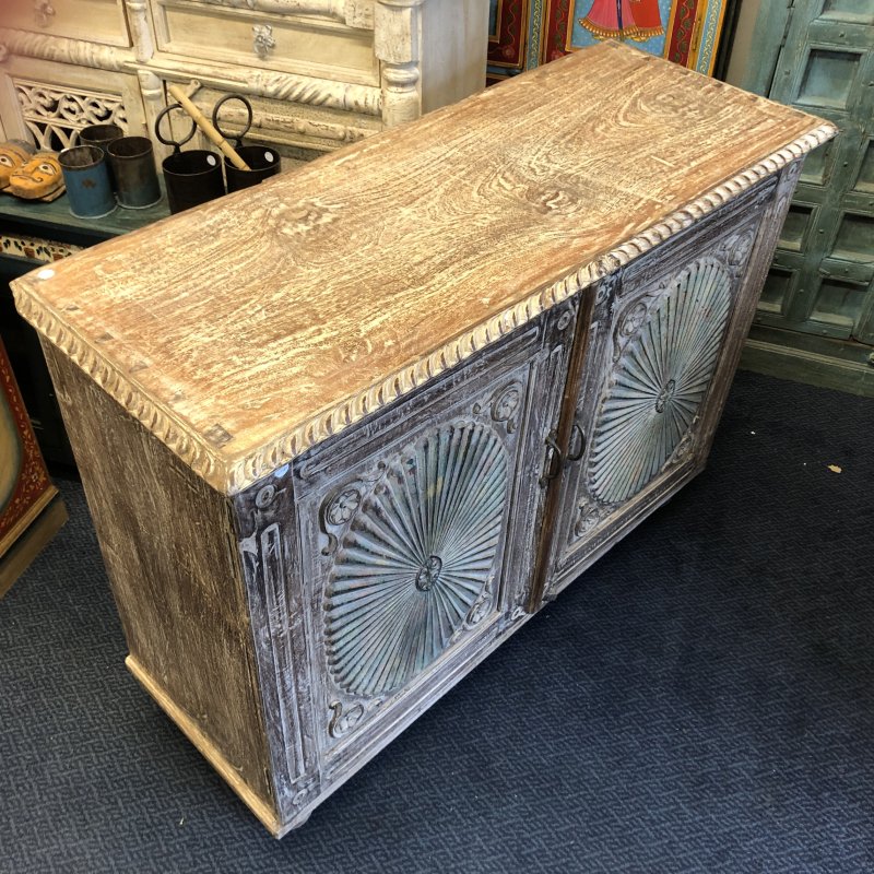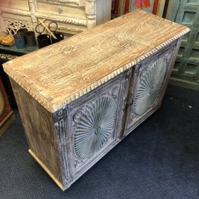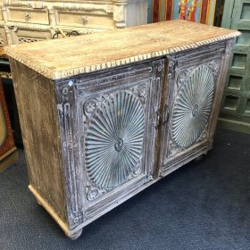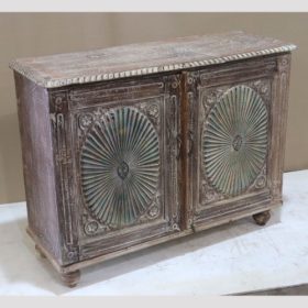 Elevate your home décor with this stunning vintage rustic sideboard, handcrafted in Jodhpur, India. Its weathered wood finish exudes a charming vintage appeal, while intricate carvings and vibrant patina detail add a touch of artistry. The spacious interior offers ample storage, perfect for organising your essentials or showcasing decorative items. Ideal for a living room, dining area, or hallway, this piece combines functionality with timeless beauty. Bring a piece of Indian craftsmanship into your home today!