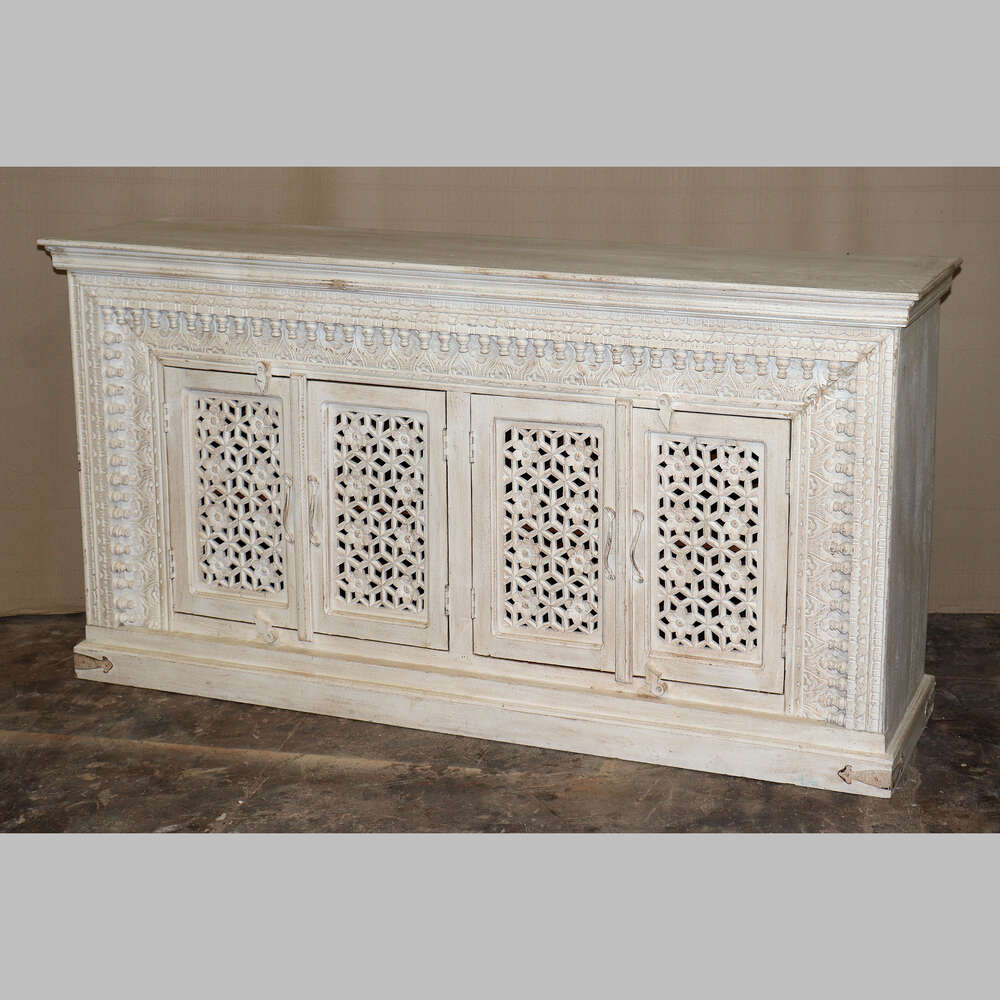 This striking spindle sideboard originates from Jodhpur, where skilled artisans have intricately hand-carved the fretwork floral doors. Inside, you’ll find two cupboard areas, each featuring a fitted shelf. Made from native mango wood, this sideboard is beautifully enhanced by the carved spindles that frame the front. Its attractive cream colour, combined with an eggshell finish, allows some of the dark wood to show through, adding a unique touch of Rajasthan to your home. Truly a remarkable piece of furniture!